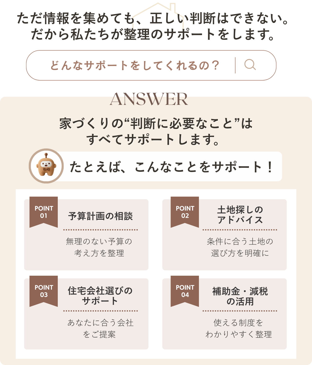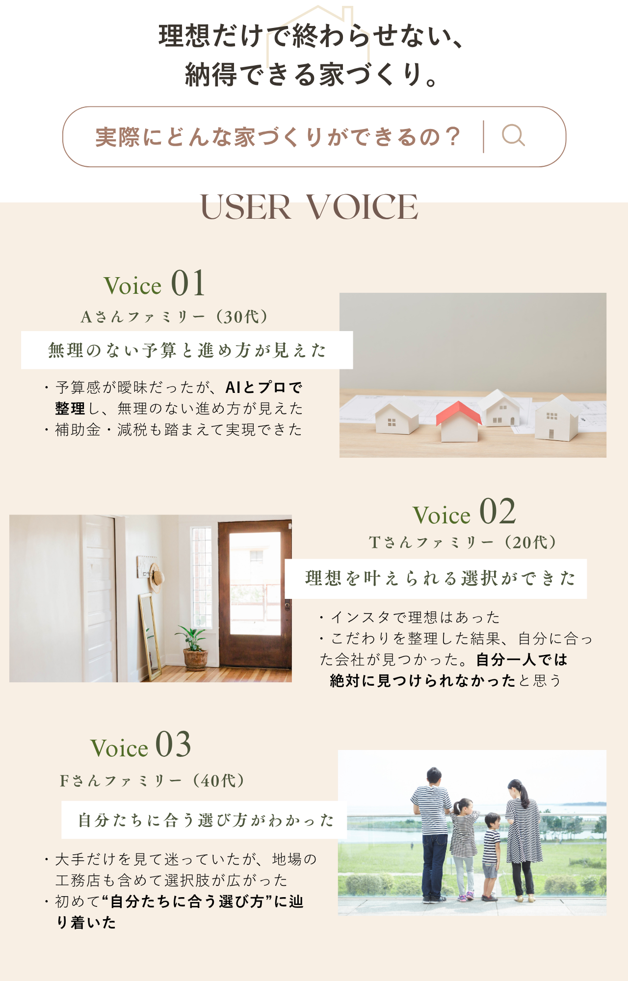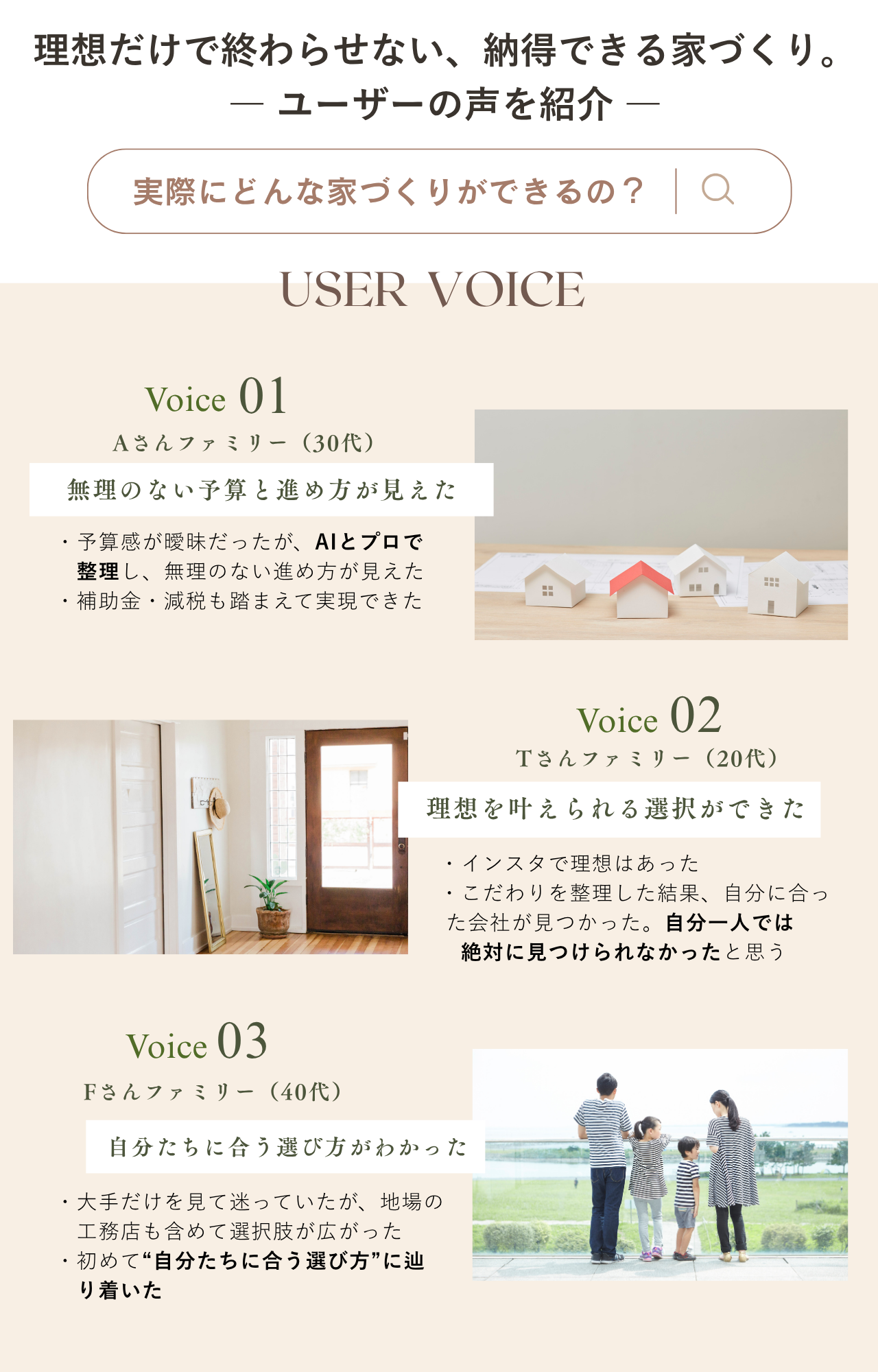 住宅を考え始めると、「予算は?」「土地ってどう選ぶ?」「どの住宅会社が良いの?」と、不安や疑問が次々に出てきます。ここでは、家づくりを経験した先輩たちのリアルな体験談と、住宅選びの基本をわかりやすくまとめました。