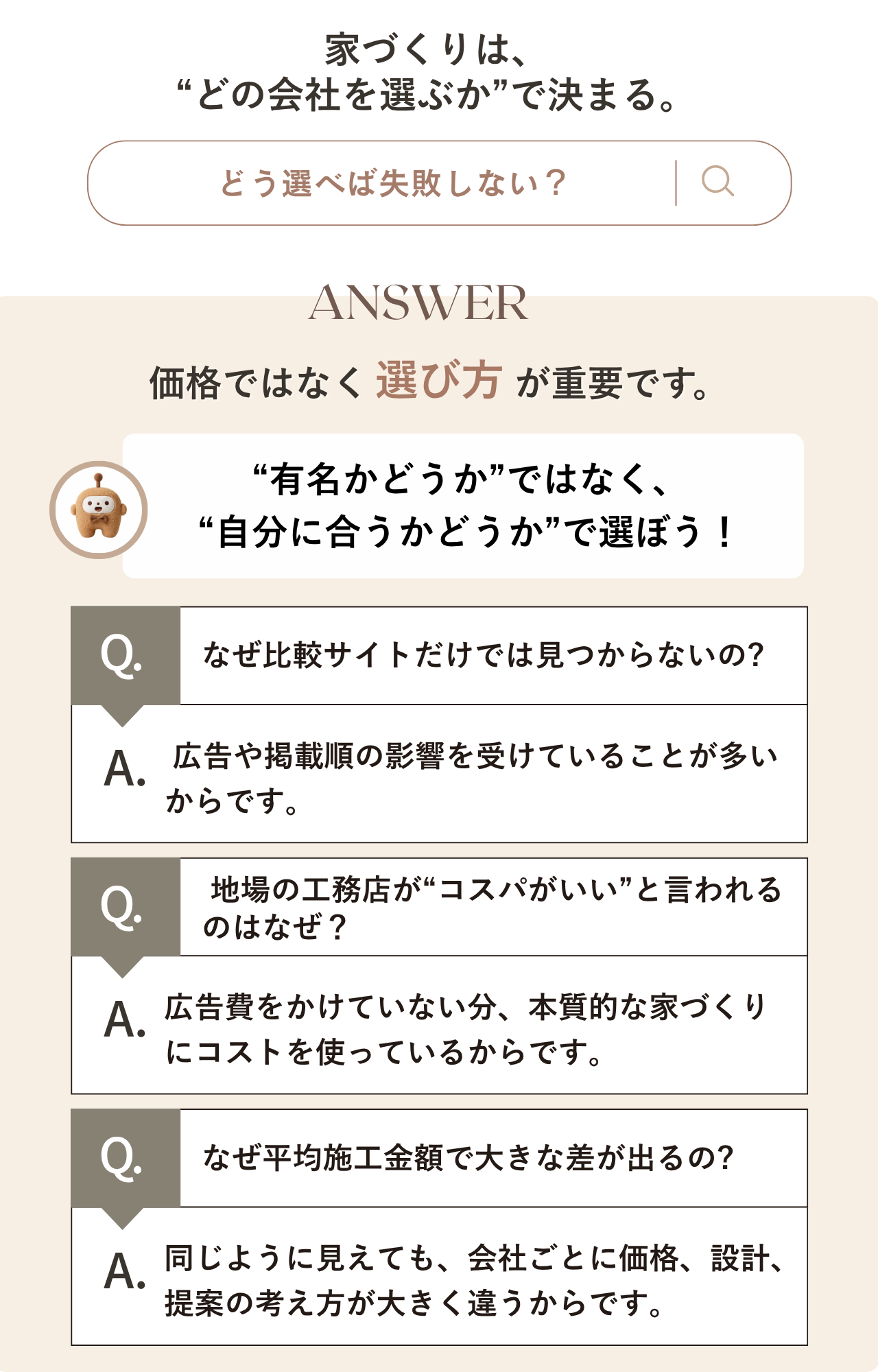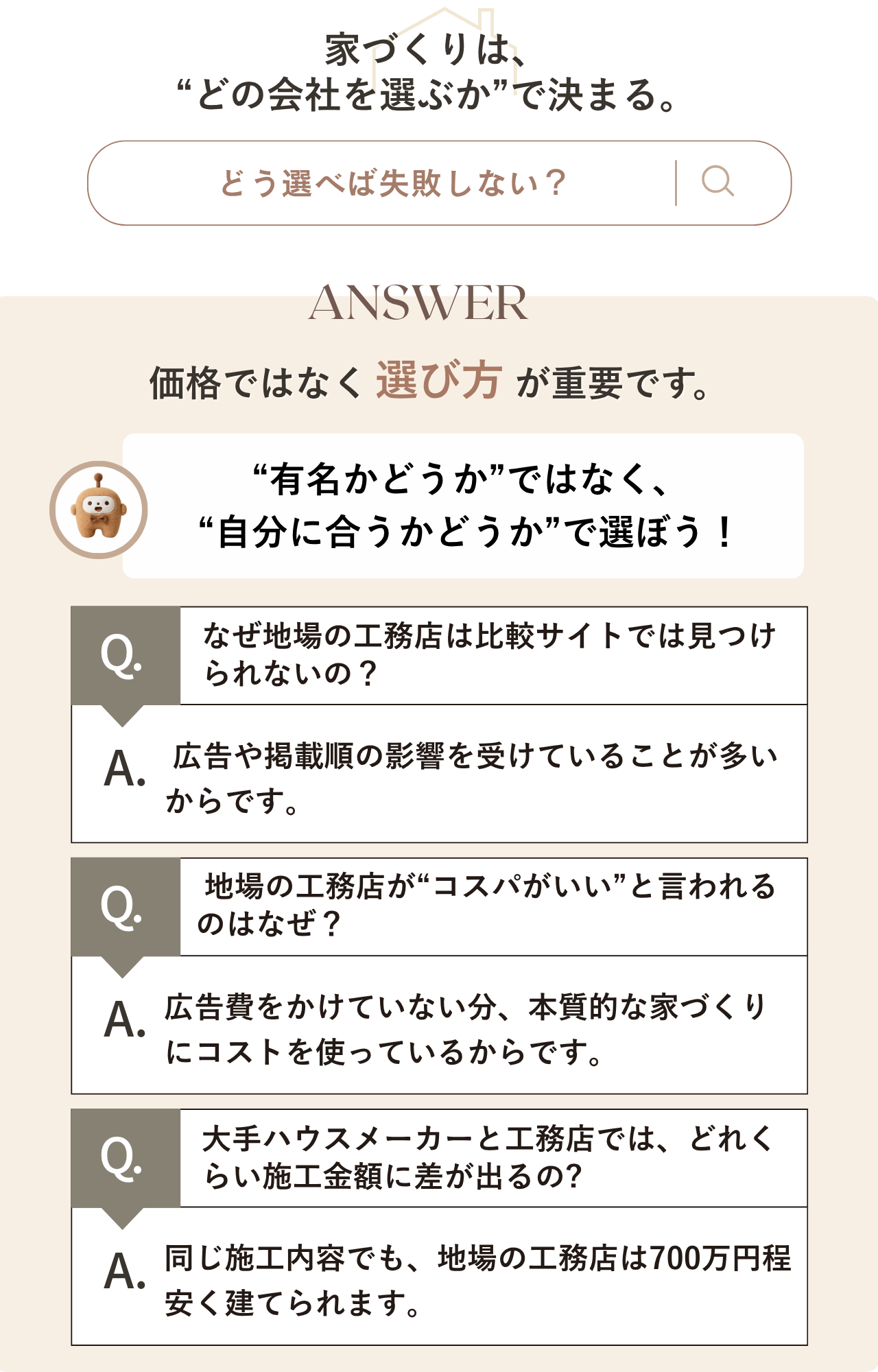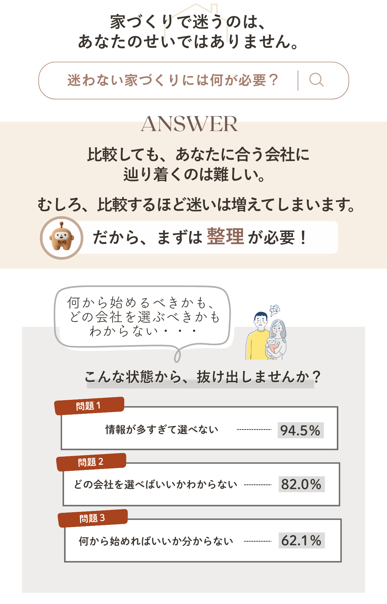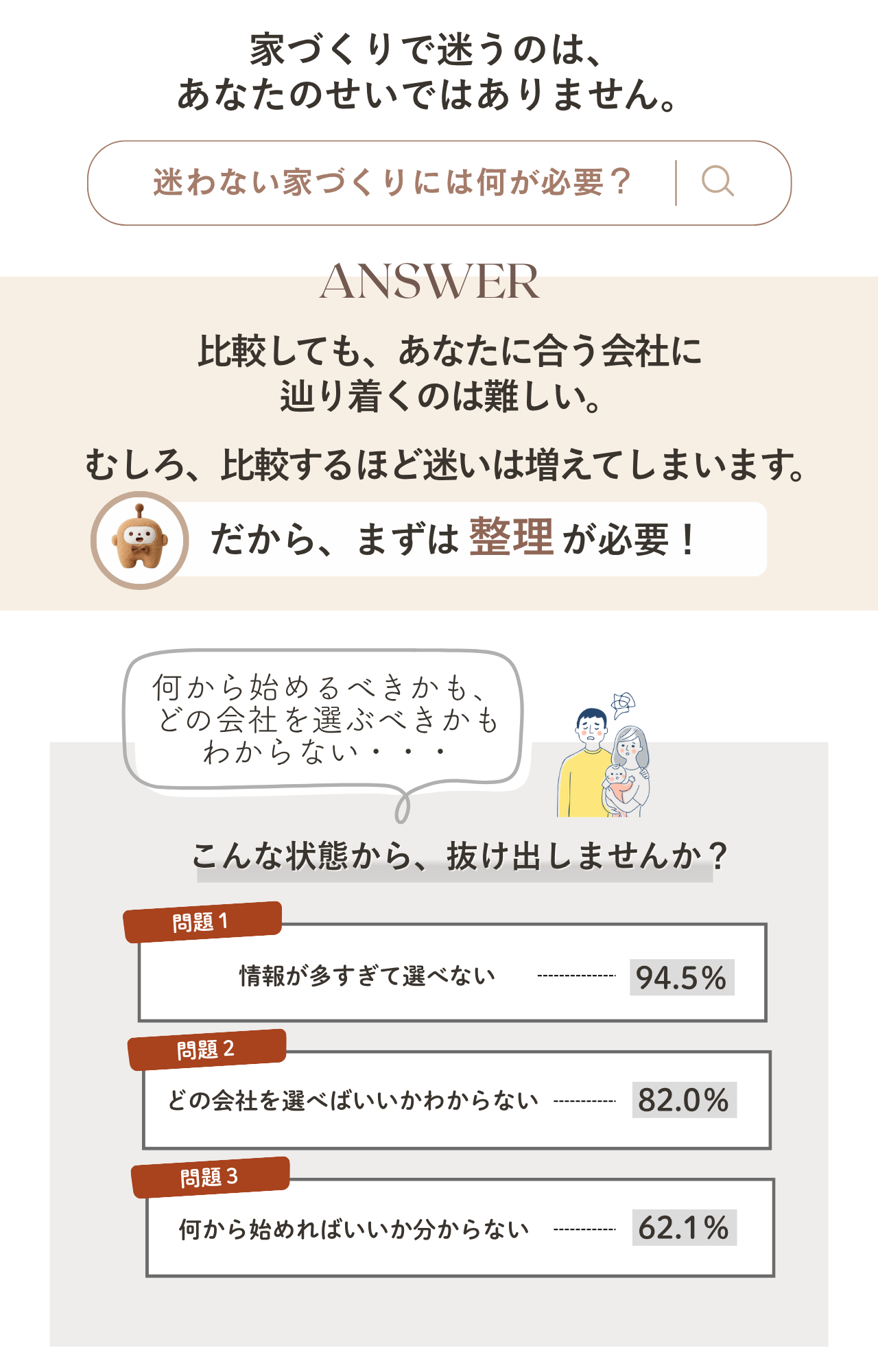 住宅を考え始めると、「予算は?」「土地ってどう選ぶ?」「どの住宅会社が良いの?」と、不安や疑問が次々に出てきます。ここでは、家づくりを経験した先輩たちのリアルな体験談と、住宅選びの基本をわかりやすくまとめました。
