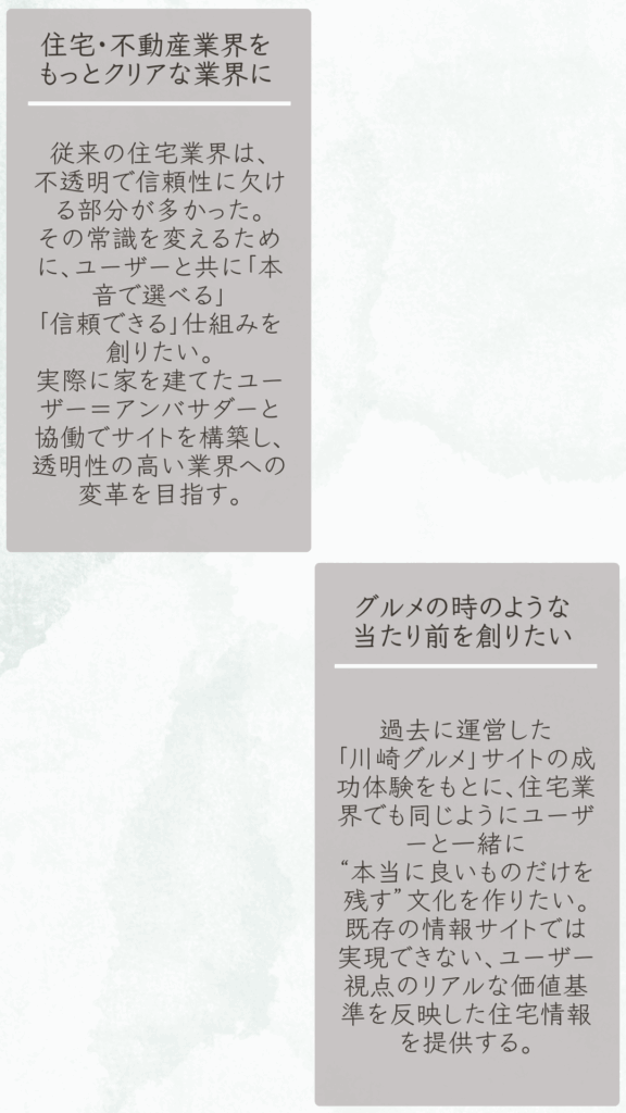私たちは、昨年・今年に実際に家を建てたユーザーのリアルな声をもとに、“もっと幸せな住まい選びが当たり前になる”未来を目指して、このサイトを立ち上げました。