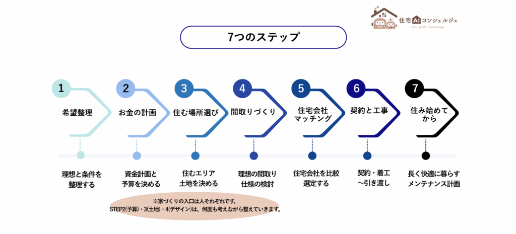 「要望整理→予算・土地・デザイン→会社→契約→完成」