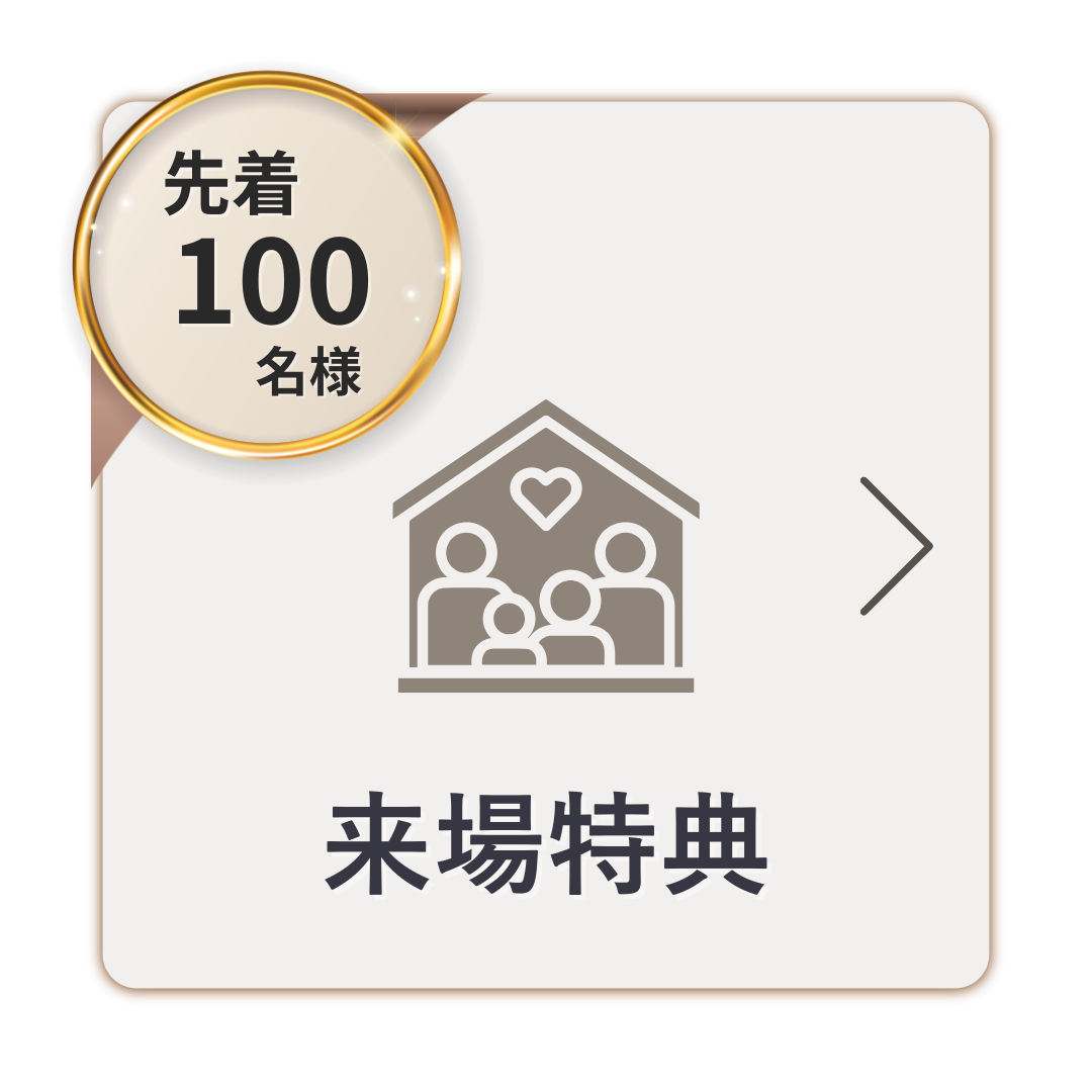 家づくりをもっと安心に、もっと楽しく。今だけの特別特典で、あなたの理想の住まいづくりをサポートします。登録・来場・ご契約の各ステップで、ささやかではありますが特典をご用意しました。ぜひこの機会にご活用ください。